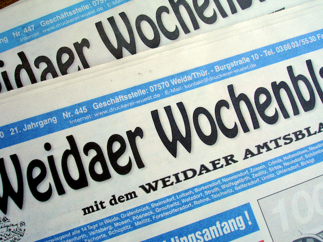Das Weidaer Wochenblatt erscheint dieses Jahr mit insgesamt 20 Ausgaben, in der Regel aller 14 Tage. Damit werden 8.525 Haushalte versorgt. Auf unserer Internetseite unter "Weidaer Wochenblatt" sind schon jetzt die Erscheinungstermine für das Jahr veröffentlicht sind. Somit können Sie Ihre Inserate, Mitteilungen und Werbeanzeigen zielgerichtet planen und uns mitteilen. Zu den Erscheinungsterminen.